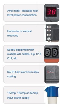 Zero U, Vertical, Metered, Outlets: IEC-60320 C13 x 16-Way + IEC-C19 x 4-Way,